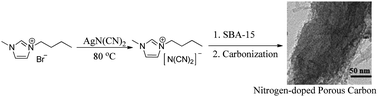 Nitrogen-doped mesoporous carbon materials are prepared via carbonization of a room temperature ionic liquid, 1-butyl-3-methylimidazolium dicyanamide (BMIMdca), using mesoporous silica template (SBA-15). The nitrogen content and nanostructure of resultant carbon materials are highly dependent on the carbonization temperature. The produced porous carbon materials were further applied as the electrode materials for supercapacitors. The porous structure and nitrogen functionalities enable the carbon materials with the specific capacitance of 210 F g-1 at a current density of 1 A g-1 in 6 M KOH aqueous solution. Furthermore, the nitrogen-doped porous carbon materials maintain a high capacitance retention capability (~95%) after 1000 cycles at a current density of 1 A g-1, indicating that this kind of nitrogen-doped carbon materials originated from the room temperature ionic liquids are promising electrode material for high-performance supercapacitors. These results may provid a facile synthesis of sulfur and nitrogen or multi-elements doped porous carbon materials originated from ionic liquids for supercapacitors.