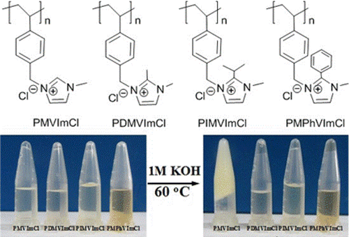 . The alkaline stability of C2-substituted imidazolium salts was found in the following order: [EDMIm][Br]>[EIMIm][Br]>[EMPhIm][Br].