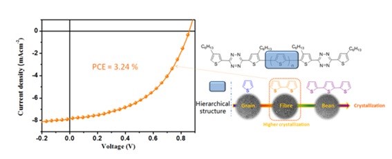 A series of high coplanar alternative linear small molecules with acceptor–donor–acceptor (A–D–A) structure containing electron-accepting tetrazine (Tz) moiety and electron-donating oligothiophenes (OTs) moiety, alkylated thiophene attached to both sides of the Tz moiety were designed and synthesized. The influences of varied oligothiophene length on small molecules’ optical and electrochemical properties, crystallization, self assembling morphology in blend film with (6,6)-phenyl-C61-butyric acid methyl ester (PC61BM), and photovoltaic properties for the application as donor materials in organic solar cells (OSCs) were studied. The optical and electrochemical properties of small molecules showed that the HOMO and LUMO energy levels were determined by the number of OTs moiety and electron-accepting ability of Tz in the alternative small molecules, respectively. Meanwhile, the varied OT moieties can significantly affect the hierarchical structures when mixed with PC61BM. The molecule with intermediate conjugate moity length showed the highest ordering in its crystalline state, as revealed by differential scanning calorimetry (DSC) and X-ray diffraction experiments, and best photovoltaic properties when blended together with PC61BM or (6,6)-phenyl-C71-butyric acid methyl ester (PC71BM) as active layer in photovoltaic devices. The results indicate that hierarchical structures controlled by adjusting the conjugate moity length of small molecules is an effective way to improve the performance of OSCs. The photovoltaic device based on TT(HTTzHT)2:PC71BM with 1% DIO additives showed the best performance, with a Jsc of 7.87 mA/cm2 and a PCE of 3.24%.