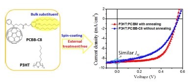 A bulk tri(octyloxy)benzene moiety grafted onto fullerene (PCBB-C8) was successfully synthesized, which could effectively induce poly(3-hexylthiophene) (P3HT) to form highly ordered bulk heterojunction structure without any external treatment. This ordered active layer exhibits good photovoltaic performance.