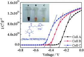 The imidazolium functionalized stable organic radical 2,2,6,6-tetramethyl-piperidine-1-oxyl (TEMPO), and 1-methyl-3-(2-oxo-2-(2,2,6,6-tetramethyl-1-oxyl-4-piperidoxyl) butyl)imidazolium bis(trifluoromethanesulfonyl) imide ([MeIm-TEMPO][TFSI]), were synthesized and characterized. The prepared [MeIm-TEMPO][TFSI]/1-propyl-3-methylimidazolium iodide (PMII) hybrid redox couple showed negligible absorption in the visible region and higher redox potential as compared with the iodide/triiodide (I−/I3−) redox couple. The resulting dye-sensitized solar cells (DSSCs) containing the imidazolium functionalized TEMPO/PMII hybrid redox couple in combination with organic dye (D205) exhibited average overall power conversion efficiencies of 8.2% and 9.1% under simulated air mass 1.5 solar spectrum illumination at 100 mW cm−2 and 50 mW cm−2, respectively, which are higher than that of the traditional PMII/I2 based electrolyte, probably due to the enhancement of the Voc and Jsc values of the hybrid electrolytes.