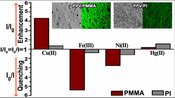 Poly(phenylenevinylene)/polyimide (PPV/PI) and poly(phenylenevinylene)/ polymethylmethacrylate (PPV/PMMA) fibrous membranes without any deliberately introduced receptors were prepared as fluorescence sensing materials through electrospinning, followed by thermal treatment. Both of these membranes displayed higher sensitivity toward most cations compared to the corresponding spin-coated films. PPV/PMMA membranes were more sensitive than PPV/PI membranes toward Cu2+ and Fe3+. About 4.5 fold of intensity enhancement upon 20 nM of Cu2+, 80% of quenching upon 20 nM of Fe3+ with fast response and simple regeneration were realized for PPV/PMMA membrane. The preliminary investigation into the mechanism revealed that the properties of the polymer matrix and thermal treatment of the membrane played important roles in the sensing performance.