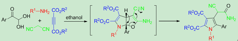 A highly efficient, catalyst-free synthesis of polysubstituted pyrroles by means of a novel four-component domino reaction of an arylglyoxal monohydrate, an aniline, a dialkyl but-2-ynedioate, and malononitrile is reported. This transformation proceeded via a 6,6a-dihydrofuro[2,3-b]pyrrole as the key intermediate.