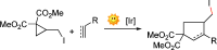Radical chemistry! A visible-light-promoted, tin/boron-free intermolecular [3+2] atom-transfer radical cyclization reaction was developed by using iridium polyphenylpridinyl complex as the sensitizer (see scheme). 2-(Iodomethyl)cyclopropane-1,1-dicarboxylate reacted with various alkenes and alkynes to form cyclopentane and cyclopentene derivatives.