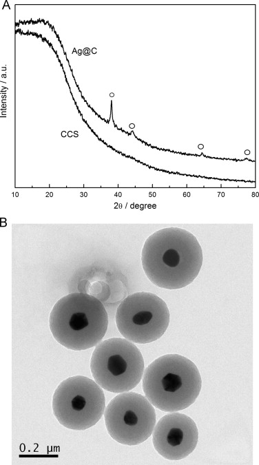 Fig. 1. XRD pattern (A) and TEM image (B) of the Ag@C nanocomposite.