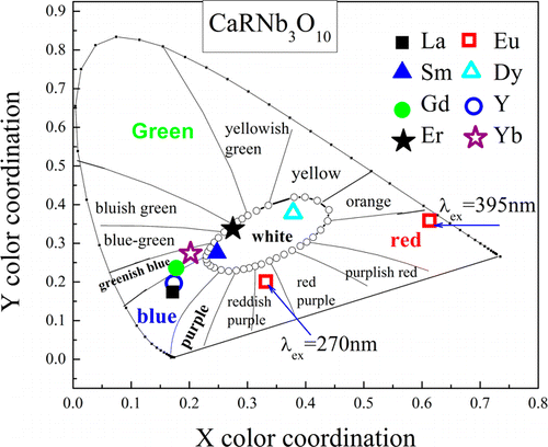 Niobates CaRNb3O10 (R = La, Sm, Eu, Gd, Dy, Er, Yb, or Y) were prepared by conventional high-temperature solid-state reaction. The formation of a single-phase compound with triple-layered perovskite-type structure was verified through X-ray diffraction (XRD) studies. The luminescence characteristics such as photoluminescence excitation and emission spectra, X-ray-excited luminescence (XEL), Stokes shift, decay curves, and color coordinates were investigated. The niobates can be efficiently excited by UV light and present luminescence behaviors with rich luminescence colors. Under excitation by ultraviolet radiation, CaRNb3O10 (R = La, Gd, Yb, or Y) exhibits strong blue luminescence due to the self-activation center of the octahedral NbO6 groups, even at room temperature. For the materials of composition CaRNb3O10 (R = Sm, Eu, Dy, or Er), the excitation at the host band produces a characteristic luminescence of rare earth ions, indicating a host–guest energy transfer process. CaRNb3O10 (R = Eu) has the strongest luminescence intensity, which can be efficiently excitated by near UV wavelength. It could be suggested to be a potential candidate for the application on near-UV excited white LEDs.