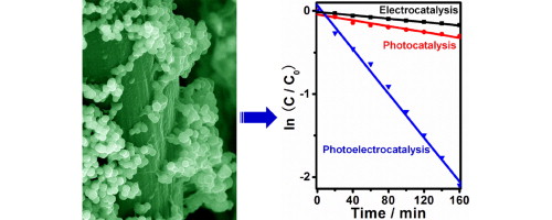 Reduced graphene oxide nanosheets modified TiO2 nanospheres on carbon cloth electrodes (RGO/TiO2/CC) have been fabricated and used for photoelectrocatalytic (PEC) degradation of organic pollutants under visible light irradiation. The fabricated RGO/TiO2/CC electrodes were characterized by scanning electron microscopy (SEM), X-ray diffraction (XRD), X-ray photoelectron spectroscopy (XPS), and UV–vis diffuse reflectance spectroscopy. Compared with TiO2/CC electrode, the RGO modified TiO2/CC electrode evidently shows improved visible light-driven PEC activity for degradation of an often used model pollutant, methylene blue (MB). Moreover, the efficiency of MB degradation by PEC process (0.0133 min−1) is about 13-fold and 7-fold faster than that of electrochemical process (0.001 min−1) and photocatalytic process (0.0018 min−1), respectively. The improved catalytic activity for PEC degradation of MB pollutants could be attributed to the existence of RGO, which extends the absorption onset of TiO2 to longer wavelength direction and promotes the separation of electron–hole pairs generated under visible light irradiation. The promotion effect on the electron–hole separation is supported by photocurrent and electrochemical impedance measurements. In addition, a synergetic effect of photocatalysis and electrocatalysis is involved in the PEC process, by which the recombination of photogenerated electron–hole pairs is significantly suppressed.