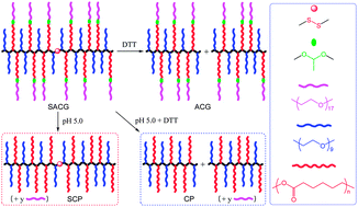 A novel disulfide- and acetal-linked graft copolymer (SACG) comprising acetal-bridged poly(ε-caprolactone)-b-poly(ethylene glycol) and PEG pendent chains and relatively short polymethacrylate backbone (DP ≈ 24) was synthesized and self-assembled for in vitro encapsulation and release of an anticancer drug, doxorubicin (DOX). Three-step reactions involving (i) RAFT copolymerization of 2-hydroxyethyl methacrylate and poly(ethylene glycol) methyl ether methacrylate, (ii) ring-opening polymerization to generate PCL chains, and (iii) hydroxyl-vinyloxy adductive reaction to introduce acid-cleavable PEG segments were used to achieve the target copolymer. Meanwhile, well-defined normal (CP) and disulfide-linked (SCP) poly(PEG-co-PCL) comb-like copolymers and acid-cleavable poly(PEG-co-PCL)-graft-MVPEG copolymer (ACG) were synthesized and acted as analogues of SACG upon external stimuli. The macromolecular architecture significantly affected the melting and crystallization behaviors and aggregation properties of copolymers, and the difference in topology and location of cleavable linkages resulted in distinctly different stimuli-triggered drug release behaviors. Owing to the dissociation and reaggregation of cleaved copolymer aggregates, stimuli-cleavable aggregates in response to external stimuli (pH 5.0, 10 mM DTT) could exhibit faster release kinetics than CP aggregates, and the maximum increment of cumulative release from various aggregates for 72 h was liable to decrease in the order SACG > ACG > SCP > CP. The cumulative release from SACG aggregates could be adjusted in the widest range via addition of different stimuli, revealing the great potential of dually cleavable copolymer aggregates in smart drug delivery systems.