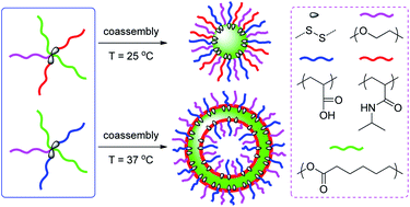 Novel 5-arm PEG(PCL)2(PNIPAM)2 (S1) and PEG(PCL)2(PAA)2 (S3) star terpolymers were synthesized, and their aggregates formed by a single star or mixed stars were efficiently used for loading and release of doxorubicin upon dual and triple stimuli. The star terpolymers had two disulfide moieties and poly(ethylene glycol) (PEG, A), poly(ε-caprolactone) (PCL, B), poly(N-isopropylacrylamide) (PNIPAM, C1), poly(tert-butyl acrylate) (PtBA, C2), and poly(acrylic acid) (PAA, C3) segments. Terminal diazide functionalized PEG (PEG-(N3)2) and alkyne-mid-functionalized PCL-b-PNIPAM and PCL-b-PtBA diblock copolymers were subjected to an azide–alkyne cycloaddition reaction to generate AB2C2 (C = C1 and C2) stars followed by selective hydrolysis to obtain a PEG(PCL)2(PAA)2 star. Polymeric micelles were prepared by self-assembly of a single star in aqueous solution, and coaggregates were obtained by coassembly of S1 and S3 mixtures. Various polymeric aggregates had great potential as controlled delivery vehicles due to their reasonable drug loading efficiency and stimuli-adjustable drug release properties. As compared with dually sensitive micelles formed from a single star, triply stimuli-responsive coaggregates may be more promising as controlled delivery vehicles since the drug release properties can be potentially adjusted by various external stimuli and composition of star mixtures.