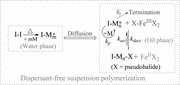 An iron-mediated reverse ATRP of methyl methacrylate (MMA) is successfully carried out in water in the absence of any dispersants, using a water-soluble 2,2′-azobis(2-methylpropionamidine) dihydrochloride (V-50) as the initiator and the stabilizer, and using an oil-soluble N,N-butyldithiocarbamate ferrum (Fe(S2CN(C4H9)2)3) as the catalyst without adding any additional ligands. Micron-sized PMMA particles with UV light-sensitive -S2CN(C4H9)2 end group are obtained, and monomer droplet nucleation and suspension polymerization mechanism are proposed. Polymerization results demonstrated typical “living”/controlled characteristics of ATRP: first-order polymerization kinetics, linear increase of molecular weights with monomer conversion and narrow molecular weight distributions for the resultant PMMA particles. NMR spectroscopy and chain-extension experiments under UV light irradiation confirm the attachment and livingness of UV light-sensitive -S2CN(C4H9)2 group in the chain end.