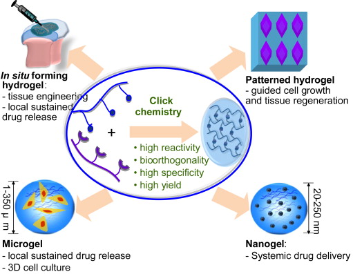 Hydrogels, microgels and nanogels have emerged as versatile and viable platforms for sustained protein release, targeted drug delivery, and tissue engineering due to excellent biocompatibility, a microporous structure with tunable porosity and pore size, and dimensions spanning from human organs, cells to viruses. In the past decade, remarkable advances in hydrogels, microgels and nanogels have been achieved with click chemistry. It is a most promising strategy to prepare gels with varying dimensions owing to its high reactivity, superb selectivity, and mild reaction conditions. In particular, the recent development of copper-free click chemistry such as strain-promoted azide-alkyne cycloaddition, radical mediated thiol-ene chemistry, Diels–Alder reaction, tetrazole-alkene photo-click chemistry, and oxime reaction renders it possible to form hydrogels, microgels and nanogels without the use of potentially toxic catalysts or immunogenic enzymes that are commonly required. Notably, unlike other chemical approaches, click chemistry owing to its unique bioorthogonal feature does not interfere with encapsulated bioactives such as living cells, proteins and drugs and furthermore allows versatile preparation of micropatterned biomimetic hydrogels, functional microgels and nanogels. In this review, recent exciting developments in click hydrogels, microgels and nanogels, as well as their biomedical applications such as controlled protein and drug release, tissue engineering, and regenerative medicine are presented and discussed.