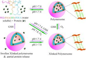 The clinical applications of protein drugs are restricted because of the absence of viable protein delivery vehicles. Here, we report on reduction- and pH--sensitive crosslinked polymersomes based on the poly(ethylene glycol)–poly(acrylic acid)–poly(2-(diethyl amino)ethyl methacrylate) (PEG–PAA–PDEA) triblock copolymer for efficient intracellular delivery of proteins and the potent induction of cancer cell apoptosis. PEG–PAA–PDEA (1.9–0.8–8.2 kg mol−1) was synthesized by controlled reversible addition-fragmentation chain transfer polymerization and further modified with cysteamine to yield the thiol-containing PEG–PAA(SH)–PDEA copolymer. PEG–PAA(SH)–PDEA was water-soluble at acidic and physiological pH but formed robust and monodisperse polymersomes with an average size of ∼35 nm upon increasing the pH to 7.8 or above followed by oxidative crosslinking. These disulfide-crosslinked polymersomes, while exhibiting excellent colloidal stability, were rapidly dissociated in response to 10 mM glutathione at neutral or mildly acidic conditions. Notably, these polymersomes could efficiently load proteins like bovine serum albumin and cytochrome C (CC). The in vitro release studies revealed that protein release was fast and nearly quantitative under the intracellular-mimicking reducing environment. Confocal microscopy observations showed that these dual-sensitive polymersomes efficiently released fluorescein isothiocyanate-CC into MCF-7 cells in 6 h. Most remarkably, MTT assays showed that CC-loaded dual-sensitive polymersomes induced potent cancer cell apoptosis, in which markedly decreased cell viabilities of 11.3%, 8.1% and 52.7% were observed for MCF-7, HeLa and 293T cells, respectively, at a CC dosage of 160 μg ml−1. In contrast, free CC caused no cell death under otherwise the same conditions. These dual-bioresponsive polymersomes have appeared as a multifunctional platform for active intracellular protein release.