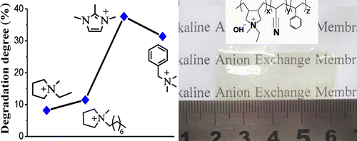 The synthesis and characterization of pyrrolidinium cation based anion exchange membranes (AEMs) are reported. Pyrrolidinium cations with various N-substituents (including methyl, ethyl, butyl, octyl, isopropyl, 2-hydroxylethyl, benzyl, and cyclohexylmethyl groups) were synthesized and investigated with respect to their chemical stability in alkaline media. The influence of substitutions on alkaline stability of pyrrolidinium cations was investigated by quantitative 1H nuclear magnetic resonance spectroscopy (NMR) and theoretical approaches. N,N-Ethylmethyl-substituted pyrrolidinium cation ([EMPy]+) exhibited the highest alkaline stability in this study. The synthesized AEMs based on [EMPy]+ show promising alkaline stability in strongly basic solution. The study of this work should provide a feasible way for improving the alkaline stability of pyrrolidinium cation based AEMs.