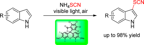 A simple and efficient visible-light-promoted method for the C-3 thiocyanation of indoles has been developed. The transformation uses Rose Bengal as the photocatalyst and air as the terminal oxidant. The reaction is mild, high-yielding, and environmentally benign.