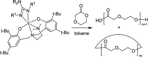 A series of neutral yttrium guanidinates supported by an amine-bridged bis(phenolate) ligand were synthesized, and their catalytic behaviors for the ring-opening polymerization of 1,4-dioxan-2-one (p-dioxanone, PDO) were explored. Metathesis reactions of amine-bridged bis(phenolate) yttrium chlorides LLnCl(THF) [L = Me2NCH2CH2N{CH2-(2-OC6H2-tBu2-3,5)}2] with corresponding lithium guanidinates generated in situ in a 1:1 molar ratio in THF gave the neutral yttrium guanidinates LY[R2NC(NR1)2] [R1 = −Cy, R2N = −N(TMS)2 (1), −NiPr2 (2), −N(CH2)5 (3); R1 = −iPr, R2N = −NiPr2 (4) −NPh2 (5))]. These complexes were well characterized by elemental analyses, IR, and NMR spectroscopy. The definitive molecular structures of these complexes were determined by single-crystal X-ray analysis. It was found that these complexes can efficiently initiate the ring-opening polymerization (ROP) of PDO, and the catalytic activity is affected by the nature of the guanidinate groups with the active sequence of 1 > 2 ≈ 3 ≈ 4 > 5. The influences of reaction conditions such as polymerization time, polymerization temperature, and molar ratio of monomer to initiator on the polymerization were also investigated. The polymerization kinetics of PDO catalyzed by complex 1 is first-order with respect to monomer concentration, and the apparent activation energy amounts to 30.8 kJ mol-1. The mechanistic investigations showed that the ROP of PDO proceeded through a coordination–insertion mechanism with a rupture of the acyl–oxygen bond of the monomer. MALDI-TOF mass spectrum analysis of the oligomer revealed that there are two kinds of polymer chains in this catalytic system, e.g., the linear chains H–[OCH2CH2OCH2CO]n–OH and the PPDO macrocycles.