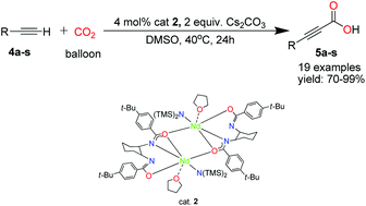Three novel bis(amidate) rare-earth metal amides {LRE[N(SiMe3)2]·THF}2 (H2L = N,N′-(cyclohexane-1,2-diyl)bis(4-tert-butylbenzamide); RE = La(1), Nd(2), Y(3)), which were prepared by the treatment of the bridged amide proligand H2L with RE[N(SiMe3)2]3 in tetrahydrofuran, have been characterized by single-crystal X-ray diffraction, elemental analyses, and NMR for complexes 1 and 3. All the complexes were found, for the first time, to be efficient catalysts for the direct carboxylation of terminal alkynes with CO2 at ambient pressure. And the Nd-based catalyst 2 showed the highest reactivity. Various propiolic acids with a good functional group tolerance were successfully synthesized in high-to-excellent yields under mild conditions.