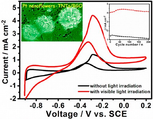In this work, Pt nanoflowers deposited on highly ordered TiO2 nanotube arrays (TNTs) by modification of reduced graphene oxide (RGO) nanostructures have been synthesized. The ternary complex (Pt-TNTs/RGO) displays efficient electrocatalytic performance toward methanol oxidation in alkaline medium. The electrochemical impedance spectroscopy (EIS) and responsive photocurrent results indicate that the presence of graphene could effectively promote charge separation during electrocatalytic process. Interestingly, with assistance of visible light illumination, the electrocatalytic activity and stability of the ternary complex electrode toward methanol oxidation are distinctly improved. Both electro- and photo-catalytic processes for methanol oxidation contribute to the enhanced catalytic performance and stability. Moreover, the ternary electrode also displays efficient photoelectrocatalytic degradation of methylene blue (MB) under visible light illumination. The present work sheds light on developing highly efficient and long-term stability catalysts for methanol oxidation with assistance of visible-light illumination.