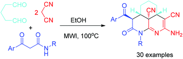 A concise and efficient one-pot synthesis of functionalized [1,8]naphthyridine derivatives via a three-component domino reaction of glutaraldehyde, malononitrile, and β-ketoamides, under catalyst-free conditions in an environmentally friendly medium (ethanol) is described. The main advantages of this protocol are short reaction times, practical simplicity, high yields, catalyst-free conditions, cheap and benign solvents, and high regio- and stereo-selectivities.