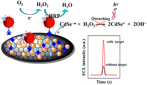 A multiple signal amplification strategy was designed for an ultrasensitive competitive immunoassay for Hg2+. This strategy was achieved using graphene conjugated with a large number of CdSe quantum dots to enhance the basal signal and enormous horseradish peroxidase (HRP) labeled with gold nanoparticles (AuNPs) to consume the coreactant H2O2 generated in situ. The immunosensor was constructed by immobilization of coating antigen on poly(diallyldimethylammonium chloride)–graphene–CdSe composites (PDDA–GN–CdSe), and a strong electrochemiluminescence (ECL) signal was obtained. When the immunosensor was immersed in antibody–AuNPs–HRP composites, the ECL signal greatly decreased, which was ascribed to the bound enzyme on the electrode surface. The self-produced coreactant H2O2 was consumed by o-phenylenediamine in the presence of enzyme, effectively decreasing the ECL intensity from the quantum dots. The Hg2+ in solution and the corresponding coating antigen competed for the limited antibody, and thus, the ECL intensity was linearly dependent on the logarithm of the mercury(II) concentration from 0.2 to 1000 ng mL–1 with a detection limit of 0.06 ng mL–1. The immunoassay exhibited good stability and accuracy and acceptable reproducibility, indicating that it provides a promising approach for the detection of trace mercury and other small molecular compounds in environmental samples.
