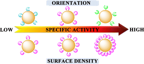 The key property of protein–nanoparticle conjugates is the bioactivity of the protein. The ability to accurately modulate the activity of protein on the nanoparticles at the interfaces is important in many applications. In the work reported here, modulation of the activity of protein–gold nanoparticle (AuNP) conjugates by specifically orienting the protein and by varying the surface density of the protein was investigated. Different orientations were achieved by introducing cysteine (Cys) residues at specific sites for binding to gold. We chose Escherichia coli inorganic pyrophosphatase (PPase) as a model protein and used site-directed mutagenesis to generate two mutant types (MTs) with a single Cys residue on the surface: MT1 with Cys near the active center and MT2 with Cys far from the active center. The relative activities of AuNP conjugates with wild type (WT), MT1, and MT2 were found to be 44.8%, 68.8%, and 91.2% of native PPase in aqueous solution. Site-directed orientation with the binding site far from the active center thus allowed almost complete preservation of the protein activity. The relative activity of WT and MT2 conjugates did not change with the surface density of the protein, while that of MT1 increased significantly with increasing surface density. These results demonstrate that site-directed orientation and surface density can both modulate the activity of proteins conjugated to AuNP and that orientation has a greater effect than density. Furthermore, increasing the surface density of the specifically oriented protein MT2, while having no significant effect on the specific activity of the protein, still allowed increased protein loading on the AuNP and thus increased the total protein activity. This is of great importance in the study on the interface of protein and nanoparticle and the applications for enzyme immobilization, drug delivery, and biocatalysis.