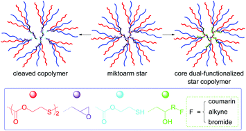 Novel amphiphilic (PEG)m(PCL)n (m ≈ n ≈ 23) miktoarm stars with a disulfide-linked epoxy-functionalized branched core were controllably synthesized via three step reactions comprising self-condensing vinyl polymerization via reversible addition–fragmentation chain transfer, epoxy-carboxyl coupling reaction and ring-opening polymerization. The star copolymers were characterized by 1H NMR spectra, GPC-MALLS, DSC and reduction-triggered degradation. Postpolymerization modification via epoxy-carboxyl/phenol coupling reactions allowed attaching dual-reactive functionalities including coumarin, alkyne and alkyl bromide onto the branched core. In water and THF–water mixtures, a coumarin-modified star copolymer could aggregate into some intriguing morphologies including hyperbranched micelles and large vesicles due to the influence of solvent polarity on aggregation behaviors. Owing to the differences in the isolation of fluorophores from solvents and restricted molecular motion, coumarin-functionalized stars exhibited adjustable fluorescence properties in water and THF–water mixtures, and their aqueous solution had a maximum quantum yield (ΦF = 44.2%). The solutions of star copolymers and their reduction-cleaved copolymers were of different hydrodynamic diameters, and the ΦF(star)/ΦF(cleaved copolymer) values were 1.85 (in THF), 3.00 (in water) and ranged between 1.29 and 2.58 in THF–water mixtures, revealing that the aggregation behaviors and fluorescence properties were strongly dependent on polymeric architecture, location of fluorophores and solvent polarity. Our study affords a versatile method to construct functional miktoarm stars with a multi-reactive branched core, and coumarin-functionalized star copolymers may have a great potential as solvent polarity and reduction dual-sensitive imaging materials in "green" ink, coatings and nanocarriers for biomedical applications.