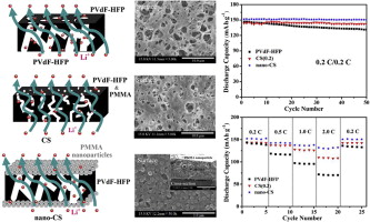 In this work, two kinds of composite separators are prepared and used for lithium-ion batteries, which are a PP nonwoven/PVdF-HFP/PMMA blending-type composite separator (CS) and a sandwich-like PP nonwoven/PVdF-HFP composite separator with the introduction of PMMA nanoparticles on the surface (nano-CS). The morphology, electrolyte uptake, ionic conductivity and electrochemical properties of the separators are studied by SEM analysis, impedance measurements, charge–discharge cycle and C-rate tests, respectively. The nano-CS and CS(0.2) exhibit similar properties in electrolyte uptake (212% and 202%, respectively) and porosity (77.9% and 75.3%, respectively). Nonetheless, nano-CS shows enhanced thermal stability and higher ionic conductivity compared with CS(0.2) and commercial PP nonwoven/PVdF-HFP separators. Meanwhile, the LiFePO4/Li half-cell assembled with nano-CS displays the best C-rate capacity and cyclability especially at the high discharge current rate, indicating that the nano-CS separator is a kind of promising candidate for the high-performance lithium-ion batteries.
