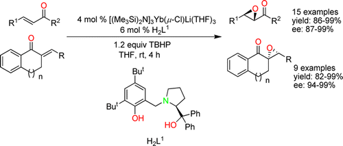 A simple and efficient catalytic enantioselective epoxidation of α,β-unsaturated ketones has been successfully developed, which was catalyzed by rare-earth metal amides [(Me3Si)2N]3RE(μ-Cl)Li(THF)3 (RE = Yb (1), La (2), Sm (3), Y (4), Lu (5)) in the presence of phenoxy-functionalized chiral prolinols at room temperature using tert-butylhydroperoxide (TBHP) as the oxidant. The combination of an Yb-based amide 1 and a chiral proligand (S)-2,4-di-tert-butyl-6-((2-(hydroxydiphenylmethyl)pyrrolidin-1-yl)methyl)phenol) performed very well, and both the yields and the enantiomeric excess of the chiral epoxides reached up to 99% and 99% ee.