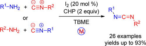 An I2/CHP-mediated cross-coupling reaction of isocyanides with readily accessible amines via C–N formation is described for carbodiimide synthesis in moderate to excellent yields. This represents a metal-free strategy for a coupling reaction of isocyanides with amines, and it provides an efficient approach for symmetric and unsymmetric functionalized carbodiimide derivative synthesis under mild conditions.