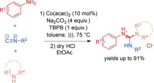 A novel and efficient cobalt-catalyzed oxidative isocyanide insertion with amines via two C—N bond formation reactions under ultrasound irradiation conditions has been developed. This protocol provides a simple, clean and general way to synthesize guanidines or their corresponding hydrochlorides from simple starting materials under ultrasonic conditions. This chemistry could also be applied to an efficient synthesis of optically active guanidines without loss of enantioselectivity.