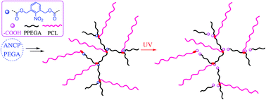 Different from hyperbranched star-like polymers and dendritic brushes, dendritic-unit-bridged hyperbranched graft copolymers (DHGCs) with branching point linked branches and linear grafts can be regarded as a new subclass of hyperbranched-graft-linear copolymers. This study aims at the synthesis and properties of photocleavable DHGCs comprising oligomeric branches composed of poly(ethylene glycol) methyl ether acrylate (PEGA) units, linear poly(ε-caprolactone) (PCL) grafts and o-nitrobenzyl ester (ONBE) moieties in the dendritic unit. Based on a multifunctional inimer 3-((2-acryloyloxymethyl-2-hydroxymethyl)propionyloxy)methyl-2-nitrobenzyl 4-cyano-4-(phenylcarbonothioylthio)pentanoate (ANCP), functional DHGCs were controllably synthesized via two step reactions. RAFT copolymerization afforded hyperbranched poly(ANCP-co-PEGA) (PAP), followed by CL polymerization to achieve PAP-g-PCL. Upon photo-cleavage, hyperbranched PAP was converted into linear polymers, and PAP-g-PCL was readily degraded into mixtures of linear, star and graft polymers. With increasing UV irradiation time, the PAP-g-PCL micelles were gradually evolved into vesicles and multicompartment vesicles due to photo-triggered cleavage and reaggregation. Upon normal and on-demand UV irradiation, the release kinetics for controlled release of Nile red from copolymer aggregates could be tuned in a wide range, revealing the great potential in smart drug delivery systems. This study affords a versatile method to construct photolabile DHGCs, which opens up a new route to explore unique properties of novel topological copolymers.
