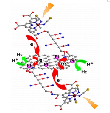 To improve the photocatalytic activity of graphene-based catalysts, an efficient photocatalytic hydrogen evolution system based on black dye N749 covalently functionalized reduced graphene oxide (rGO-N749) was synthesized. The obtained product was characterized with transmission electron microscopy (TEM), atomic force microscopy (AFM), Fourier transform infrared spectroscopy (FTIR), Raman spectra, X-ray photoelectron spectroscopy (XPS), and fluorescence and UV–vis spectroscopy. The results demonstrate that N749 has been successfully grafted on the surface of rGO. The rGO-N749 nanocomposite exhibits high light-harvesting efficiency and covered a range of wavelengths from the ultraviolet to visible light. The efficient fluorescence quenching and the enhanced photocurrent response confirm that the photoinduced electron transfers from the N749 moiety to the rGO sheet. Moreover, we chose Pt nanoparticles (NPs) as cocatalyst loading on rGO-N749 sheets to obtain the optimal H2 production effect. The platinized rGO-N749 (rGO-N749-Pt) demonstrates a quite high photocatalytic activity for hydrogen evolution from water under both UV–vis and visible light (λ > 400 nm) irradiation. The apparent quantum yields are 0.54 and 0.21% at 365 and 420 nm, respectively. These results reveal that the rGO-N749-Pt nanocomposite consolidated the advantages of N749, rGO, and Pt NPs and can be a potential candidate for hydrogen evolution from water under UV–vis or visible-light irradiation.
