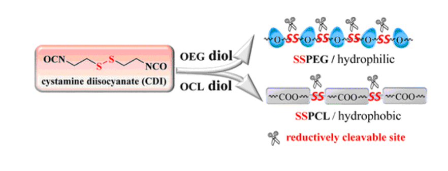 Reductively degradable biopolymers have emerged as a unique class of smart biomedical materials. Here, a functional coupling agent, cystamine diisocyanate (CDI), was designed to offer a facile access to reductively degradable biopolymers via polycondensation with various diols. CDI was readily obtained with a decent yield of 46% by reacting cystamine dihydrochloride with triphosgene. The polycondensation of oligo(ethylene glycol) diol (Mn = 0.4 or 1.5 kg/mol) or oligo(ε-caprolactone) diol (Mn = 0.53 kg/mol) with CDI in N,N-dimethylformamide at 60 °C using dibutyltin dilaurate as a catalyst afforded reductively degradable poly(ethylene glycol) (SSPEG, Mn = 6.2–76.8 kg/mol) or poly(ε-caprolactone) (SSPCL, Mn = 6.8–16.3 kg/mol), in which molecular weights were well controlled by diol/CDI molar ratios. Moreover, PEG-SSPCL-PEG triblock copolymers could be readily prepared by reacting dihydroxyl-terminated SSPCL with PEG-isocyanate derivative. PEG-SSPCL-PEG with an Mn of 5.0–16.3–5.0 kg/mol formed small-sized micelles with an average diameter of about 85 nm in PB buffer. The in vitro release studies using doxorubicin (DOX) as a model drug showed that, in sharp contrast to reduction-insensitive PEG-PCL(HDI)-PEG controls, drug release from PEG-SSPCL-PEG micelles was fast and nearly complete in 24 h under a reductive condition containing 10 mM glutathione. The confocal microscopy experiments in drug-resistant MCF-7 cells (MCF-7/ADR) displayed efficient cytoplasmic DOX release from PEG-SSPCL-PEG micelles. MTT assays revealed that DOX-loaded PEG-SSPCL-PEG micelles were much more potent against MCF-7/ADR cells than reduction-insensitive PEG-PCL(HDI)-PEG controls (IC50: 6.3 vs 55.4 μg/mL). It should further be noted that blank PEG-SSPCL-PEG micelles were noncytotoxic up to a tested concentration of 1 mg/mL. Hence, cystamine diisocyanate appears to be an innovative coupling agent that facilitates versatile synthesis of biocompatible and reductively degradable biopolymers.