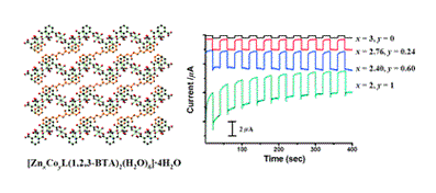 By utilizing the coordination unsaturation of 1,2,3-benzenetricarboxylate (1,2,3-BTA) and protonated N,N′-di(3-pyridyl)succinamide (L) in the as-synthesized 1D coordination polymer (CP) of [(H2L)0.5][Zn(1,2,3-BTA)(H2O)]·2H2O (1), we successfully doped an additional half equivalent of Zn2+ and Co2+ ions to yield [Zn3L(1,2,3-BTA)2(H2O)6]·4H2O (2) and [Zn2CoL(1,2,3-BTA)2(H2O)6]·4H2O (2c). Compounds 2 and 2c are also possible through direct one-pot metal–ligand assembly. With the one-pot method, [Zn2.76Co0.24L(1,2,3-BTA)2(H2O)6]·4H2O (2a) and [Zn2.40Co0.60L(1,2,3-BTA)2(H2O)6]·4H2O (2b) are accordingly prepared to demonstrate the universality of hetero-metallic doping and for probing the doping effect on photocurrent responses. Compounds 2, 2a–2c are 2D CPs formed by linking 1,2,3-BTA-based 1D chains through L ligands. Their photocurrent responses were found to be positively related to the Co2+ percentage of the doped materials.