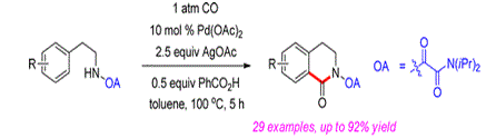 Pd-catalyzed regioselective coupling of β-C(sp2)–H bonds in aromatic amines protected by oxalyl amide with carbon monoxide is reported. The reaction could tolerate various functional groups and could afford good to excellent yields of the corresponding 3,4-dihydroisoquinolinone derivatives. Remarkably, it could also tolerate β-arylethylamino acid and thiopheneethylamine derivatives, thus showing their potential for producing several important units for bioactive compound synthesis.
