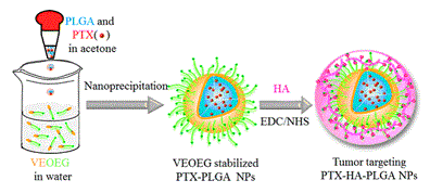 Poly(d,l-lactide-co-glycolide) (PLGA) nanoparticles have attracted an enormous interest for controlled drug delivery. Their clinical applications are, however, partly hindered by lack of biocompatible, biodegradable and functional surfactants. Here, we designed and developed a novel biocompatible surfactant based on amphiphilic vitamin E-oligo(methyl diglycol l-glutamate) (VEOEG) for facile fabrication of robust and tumor-targeting PLGA-based nanomedicines. VEOEG was prepared with controlled Mn of 1.7–2.6 kg/mol and low molecular weight distribution (Đ = 1.04–1.16) via polymerization of methyl diglycol l-glutamate N-carboxyanhydride using vitamin E-ethylenediamine derivative (VE-NH2) as an initiator. VEOEG had a hydrophile–lipophile balance data of 13.8–16.1 and critical micellar concentration of 189.3–203.8 mg/L depending on lengths of oligopeptide. Using VEOEG as a surfactant, PLGA nanoparticles could be obtained via nanoprecipitation method with a small and uniform hydrodynamic size of 135 nm and positive surface charge of +26.6 mV, in accordance with presence of amino groups at the surface. The resulting PLGA nanoparticles could be readily coated with hyaluronic acid (HA) to form highly stable, small-sized (143 nm), monodisperse, and negatively charged nanoparticles (HA-PLGA NPs). Notably, paclitaxel-loaded HA-PLGA NPs (PTX-HA-PLGA NPs) exhibited better antitumor effects in CD44-positive MCF-7 breast tumor cells than Taxol (a clinical paclitaxel formulation). The in vivo pharmacokinetics assay in nude mice displayed that PTX-HA-PLGA NPs possessed a long plasma half-life of 3.14 h. The in vivo biodistribution studies revealed that PTX-HA-PLGA NPs had a high tumor PTX level of 8.4% ID/g, about 6 times better than that of Taxol. Interestingly, therapeutic studies showed that PTX-HA-PLGA NPs caused significantly more effective tumor growth inhibition, better survival rate and lower adverse effect than Taxol. VEOEG has emerged as a versatile and functional surfactant for the fabrication of advanced anticancer nanomedicines.