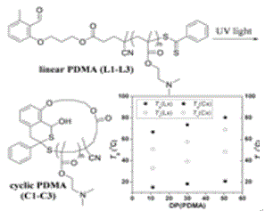This study aims at physicochemical properties of thermo- and pH/CO2-responsive cyclic homopolymers. Three examples of cyclic poly(2-(dimethylamino)ethyl methacrylate)s (PDMAs) are synthesized by combining the reversible addition–fragmentation chain transfer process and the Diels–Alder ring-closure reaction. After cyclization, the glass transition temperature significantly increases (ΔTg = 51.8–59.7 °C) due to the different configurational entropy and end groups, and the maximum decomposition temperature to lose the pendent groups is drastically decreased from 309 to 278 °C. Effects of polymerization degree, polymer concentration, additive of NaCl, and pH/CO2 on lower critical solution temperature behaviors of PDMA aqueous solutions are investigated. The cloud points (Tc) of ring PDMAs are usually higher than their linear precursors, and the ΔTc values obtained under a fixed condition can reach up to 20.7 °C, revealing the crucial role of the topology effect. This study paves the way for unique properties and applications of smart cyclic polymers and their derivatives.