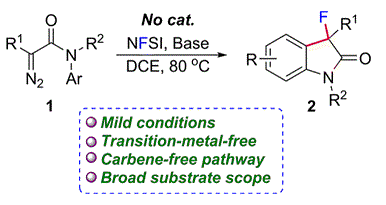 An efficient transition-metal-free fluoroarylation reaction of N-aryl diazoacetamides with NFSI (N-fluorobenzenesulfonimide) is described. This reaction directly provides 3-fluorooxindole derivatives in yields of 67–93% with high selectivity via a carbene-free process under mild reaction conditions.