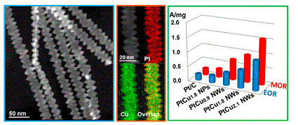 Introducing high-index facets into nanocrystals (NCs) is an effective way for boosting the electrocatalytic intrinsic activity. However, the established NCs with high-index facets usually have a big diameter, which makes them exhibit a very limited surface area, thus finally limited mass activity. To embody the advantage of high-index facets in enhancing electrocatalysis well, the better nanostructures should meet the requirement of both high surface area and high-density high-index facets. Herein, we report our important advances in making the unique three-dimensional screw thread-like platinum–copper (Pt–Cu) alloy nanowires (NWs) with high-density high-index facets and controlled composition. Such special NWs with a high surface area of 46.90 m2 g–1 exhibit much better performance than the PtCu nanoparticles (NPs) in alcohol electrooxidations. This work opens a new way for maximizing the electrocatalytic performance by introducing high-index facets into high-surface-area stable bimetallic NWs.