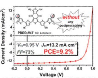 A new fluorinated polythiophene (PT) derivative, PBDD-ff4T, is designed and synthesized. The PBDD-ff4T/PC71BM-based device without any extra treatment exhibits a high efficiency of 9.2%, under the irradiation of AM 1.5G, 100 mW cm−2, which is the highest power conversion efficiency reported for PT derivative-based polymer solar cells.
