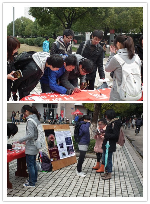 将近1点,东校区的同学们陆续回宿舍午睡休息。接下来,志愿者们以最高的效率收拾好材料,辗转来到苏州大学本部,开始新一轮的宣传活动。志愿者们来到本部同学流量最高的地区——食堂门口。在不阻碍交通的前提下,志愿者们布置好了宣传摊子。快2点的时候,同学们陆陆续续去上课,宣传活动又开始火热进行了。和早上东区的同学一样,本部同学们依然充满热情,热心、积极前来了解并加入志愿保护动物的行列中。一个接着一个积极地签下自己的名字,表明自己拒绝血腥皮草的意愿,以及热爱动物、保护动物的决心。整个下午,志愿者们收获颇丰。