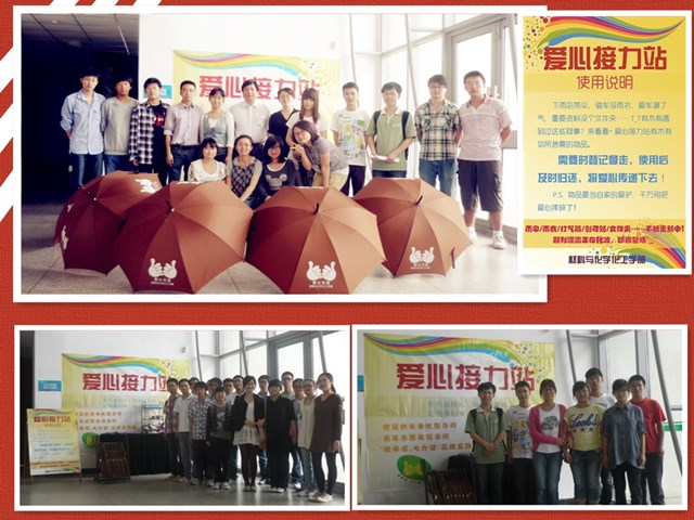 “爱心接力站”是材料与化学化工学部的党员创先争优服务岗、青年志愿服务岗、“微承诺、大力量”品牌实践岗,学部党员、先进团员践行为人民服务的窗口。小站采用“无人看管”模式,无偿提供雨伞、雨衣、针线包、创可贴、气筒等解广大师生燃眉之急的物品。借用人员只需登记“爱心借用单”留下自己的个人信息,许诺及时归还,就可无偿使用小站的所有物品。