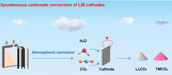 Abstract:The growing demand for lithium-ion batteries (LIBs) has intensified the need for sustainable methods to recover critical metals. Current recycling strategies, including pyrometallurgy and hydrometallurgy, often involve high energy consumption, harsh reagents, and poor selectivity, limiting their environmental and economic viability. Here, we report a chemically autonomous and energy-neutral cathode recycling process driven by atmospheric corrosion. Under humid air and dissolved CO2, aluminum current collectors undergo sustained oxidative dissolution, releasing electrons that selectively reduce transition metals (TM) in the layered oxide to TM(II). This redox reaction triggers H+ insertion, Li+/H+ exchange, and lattice destabilization, forming LixHyTMO2 intermediates that spontaneously coordinate with CO32– to yield TMCO3 or Ni2(OH)2CO3, while Li+ precipitates as Li2CO3. CO2 acts both as a proton carrier and as a coordinating ligand, sustaining the redox–coordination loop. This chemistry-driven approach redefines corrosion as a tool for selective redox transformations and offers a reagent-free, scalable pathway for LIB recycling under ambient conditions.