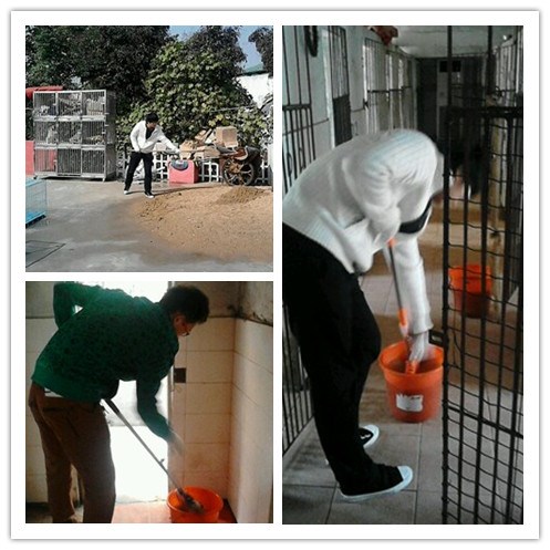 苏州大学动物保护协会的志愿者们负责狗舍的卫生打扫,在现场工作人员的指导下,开始了他们的爱心志愿任务。他们先是到工作处领到拖把,水桶等卫生工具,之后就开始了他们的工作。王瑾是参与人员的唯一的女生,但在工作的时候却一点不输给男生,无论是打扫速度还是干净程度,都不亚于另外两位参与人员。经过一个半小时的辛苦工作,三人顺利完成工作。