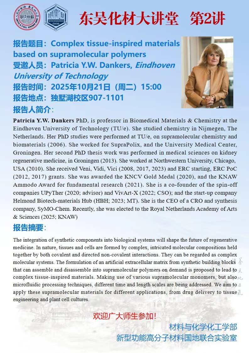 东吴化材大讲堂 | 第2讲:Complex tissue-inspired materials based on supramolecular polymers