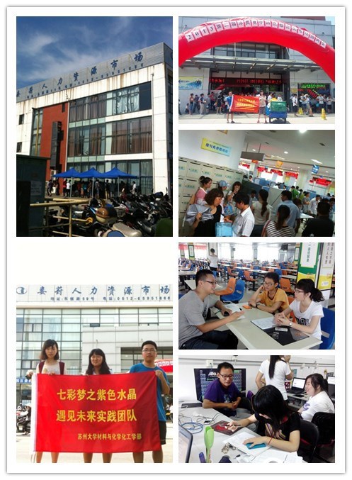 2013年7月9日,苏州大学“遇见未来——材料类专业未来升学及就业情况调查”团队,兵分三路,开始了为期7天的暑期社会实践活动。三个小组中的两组分别对曹雪琴教授以及她团队的研究生学长学姐进行了采访,另外一组则奔赴“娄葑人才市场”对用人单位进行走访。通过5月和6月两个月的精心准备,曹雪琴教授、戴礼兴教授、姚英明教授、马桂林教授、孙东豪教授都已答应接受面对面采访、黄郁健老师也通过邮件的形式接受了遇见未来团队的采访,同时遇见未来团队也制定了通过导师看发展、采访学长学姐得新知、走访招聘会现场获现状、网络资源与学校社会资源双利用的方针。正是由于前期充分的准备,全体队员都信心十足、充满斗志。
