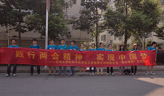7月11号去的时候,我们是早上7点30出发的,经过两站车到达目的地。很幸运的是我们在那里遇到了苏州消防医院的义诊宣传队,与同样是做义务宣传的我们很投机,大家在一起合作,共同宣传了很久,也交流了一些经验,感到不虚此行。我们遇到好多感兴趣的人,他们在横幅上签名表达自己对两会精神与对“中国梦”的追求。7月12号去的时候,因为觉得前一天的宣传力度不够大,我们换了一个地点,虽然条件有些艰苦,但我们依旧坚持着宣传下去。一些不识字的老人也来参与,他们不会写字就让我们代写,表明他们的心意。
