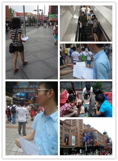 团队将调查地点设置在王府井大街。刚从旅馆出发,队员们就观察到西单的几处商场门口排满了人,其中有为防止迟到而提前到达的商场工作人员,但大部分都是等待购物的人。乘坐地铁期间,队员们基本上是被人流推着前进,队员们表示虽然团队前几天调查也乘坐过北京地铁,但并没有刻意观察类似情况,北京生活的快节奏于此处已可见一斑。在王府井商业街,团队分为四组分散调查,前往不同的地点。此次团队调查的目的是统计真正愿意停下接受问卷调查人群在总体路人中的比例。团队调查发现,只有极少数人愿意停下脚步仔细听完队员的宣传,但这些人回答问卷的题目也是匆匆略过,不愿仔细阅读题目。