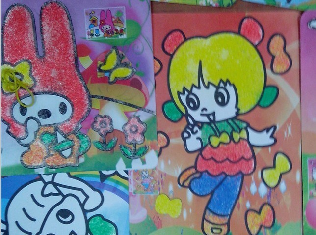 穿插着进行的还有“彩绘梦想”沙画制作,这个地方是色彩最斑斓的,大家挑着自己喜欢的喜羊羊、美少女战士、小赛车……绘图着,嬉笑着,打闹着,有些同学甚至做了一幅又一幅,乐此不疲,津津有味。