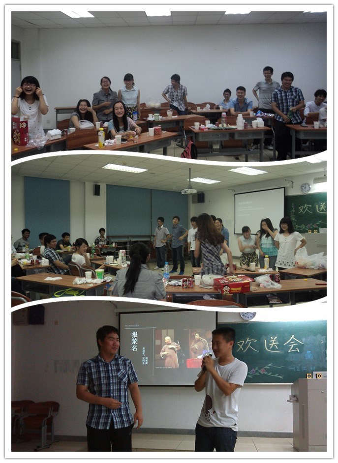 由于本学期有三位同学转专业离开12级生物功能材料班,经过班委商议决定办一次欢送会送别三位同学。为了保证这次晚会的成功举办,我们提前两个星期左右向同学们发送了飞信,希望同学们踊跃报名表演节目。同学们的反响很热烈,纷纷报名。