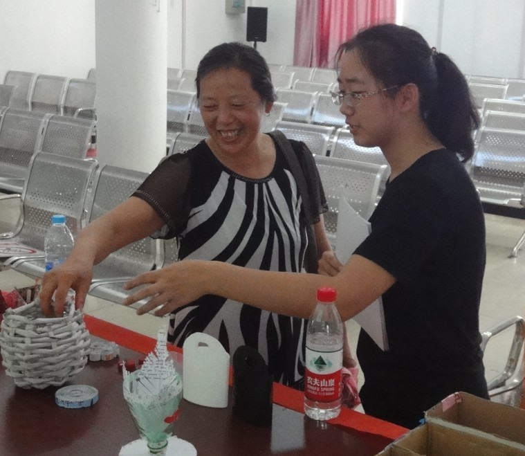 骄阳似火,炎炎的烈日丝毫没有减弱队员们社会实践的热情。早8:30许,队员们带着旧物改造的作品和打印好的制作方法乘车来到了社区,刚到社区大家便紧锣密鼓地开始布置场地,搬桌子、挂横幅、贴海报、摆作品……队员们忙得不亦乐乎。一切才准备就绪,热心的居民们就前来咨询,见他们拿起一件作品,仔细观察,这时队员们在旁仔细认真地讲解,介绍作品的材质、制作方法及用途。随后又向居民们介绍了其他一些旧物改造的方法,居民们看着成品的图片频频点头。随后居民们还填写了关于环保的问卷调查,对于一些上了年纪的人们,队员们更是将每一道问题认真地读给他们听。许多居民对这一次的活动表示高度的赞扬,希望可以有更多的机会可以了解环保方面的知识。